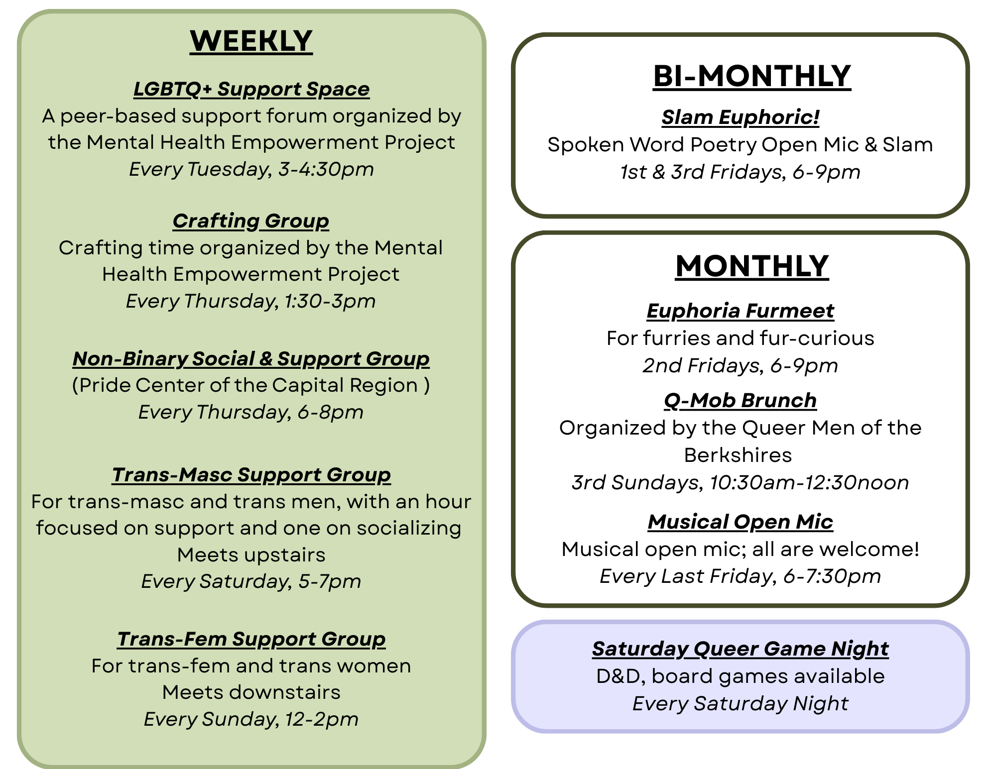 Cafe Euphoria hosts a variety of events including poetry slams, support groups, original music open mics, cosplay & furry meets, and video & tabletop gaming. With something always going on, we’re a great spot to hang out and have fun!
